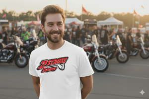 Declare your undying allegiance to the iconic sound and explosive power of the two-stroke engine with this eye-catching graphic tee. The design features the bold, stylized text “2 STROKE FOREVER” in red, black, and white, resembling classic racing logos. A subtle image of a piston is integrated into the design.
