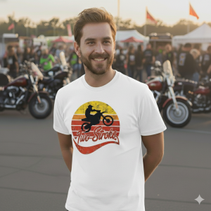 This t-shirt captures the perfect blend of vintage style and motorsports love. The graphic features a distressed, retro sunset circle with warm yellow and red stripes, framing a silhouette of a rider on a dirt bike. The script text “Two-Stroke” curves beneath, giving it a classic, nostalgic feel.